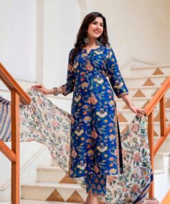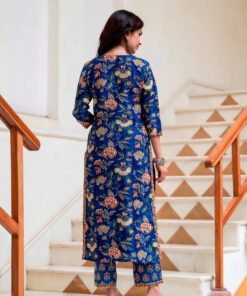 Express your sophisticated style in this Falak Chintz block Printed Chanderi Suit Set. This elegant ensemble features a graceful blue floral print, delicately rendered by hand block print for an exquisite effect. With a straight suit set and cotton pants, you’ll be sure to make an ethnic wear statement.